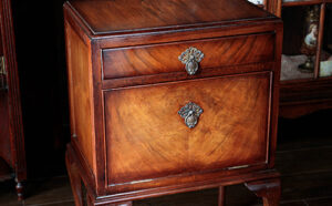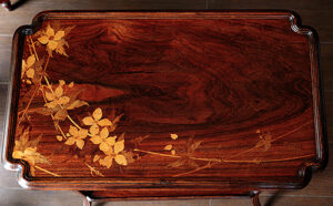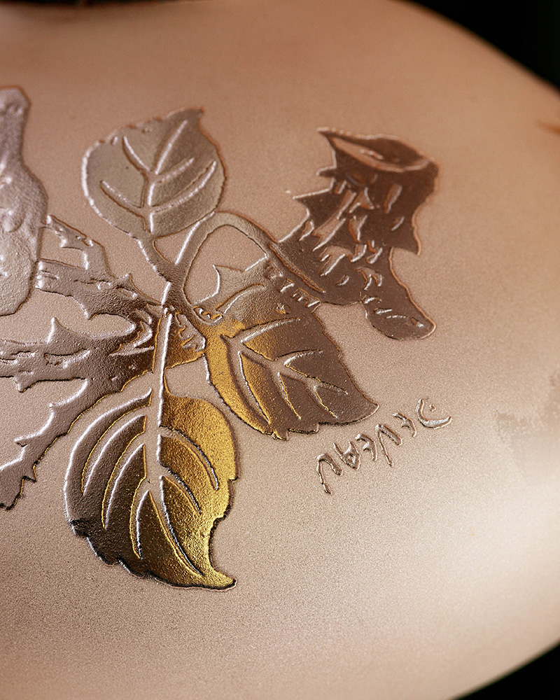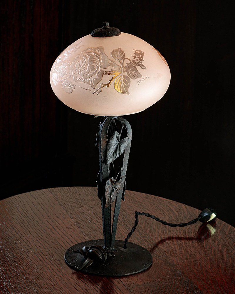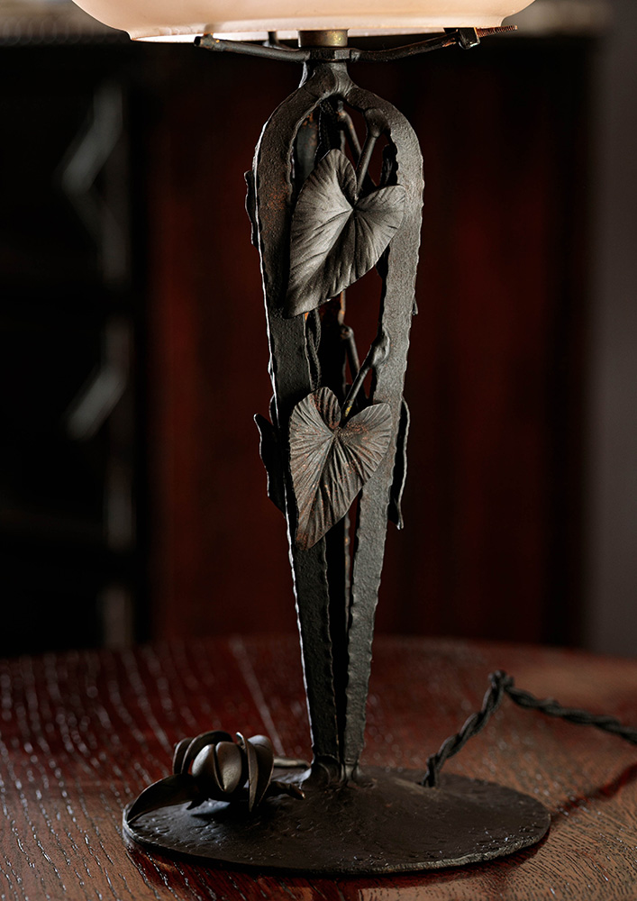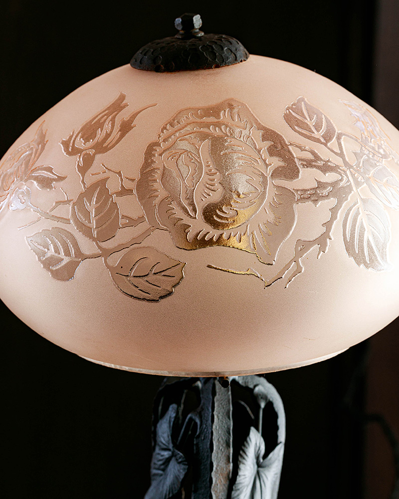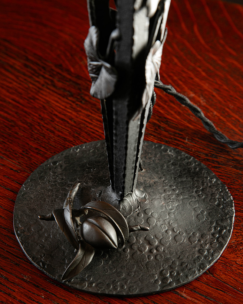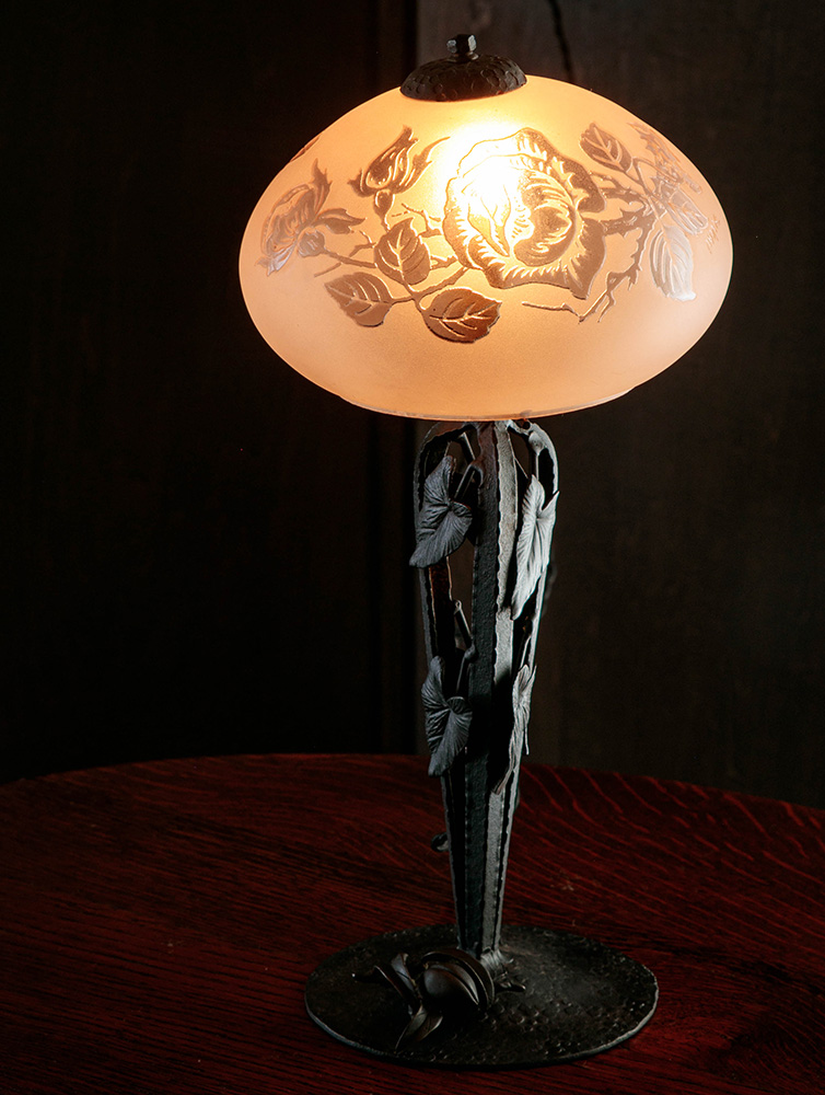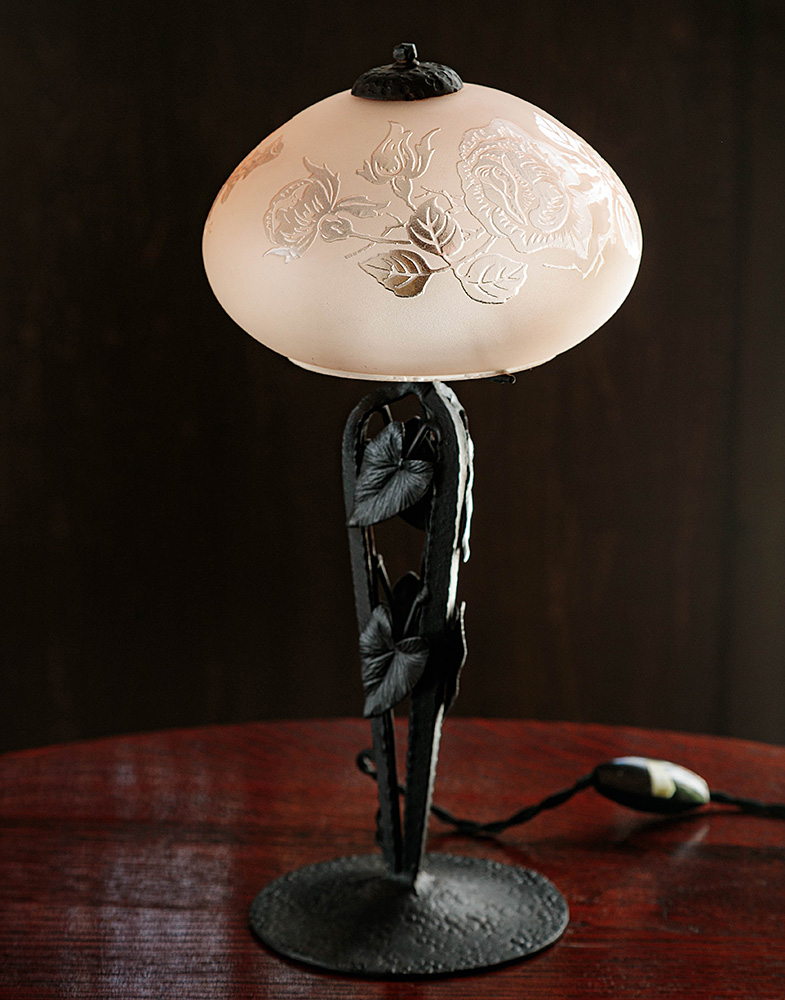 灯をともすと、酸化腐食彫りの薔薇が浮き上がり、表面が金色に輝いたように見えて大変美しいです。アイアンによるベースは丁寧な造形でシルエットがとても美しく、台座とシェードの留め金具に至るまで丁寧なたたき出し技法で仕上げられています。