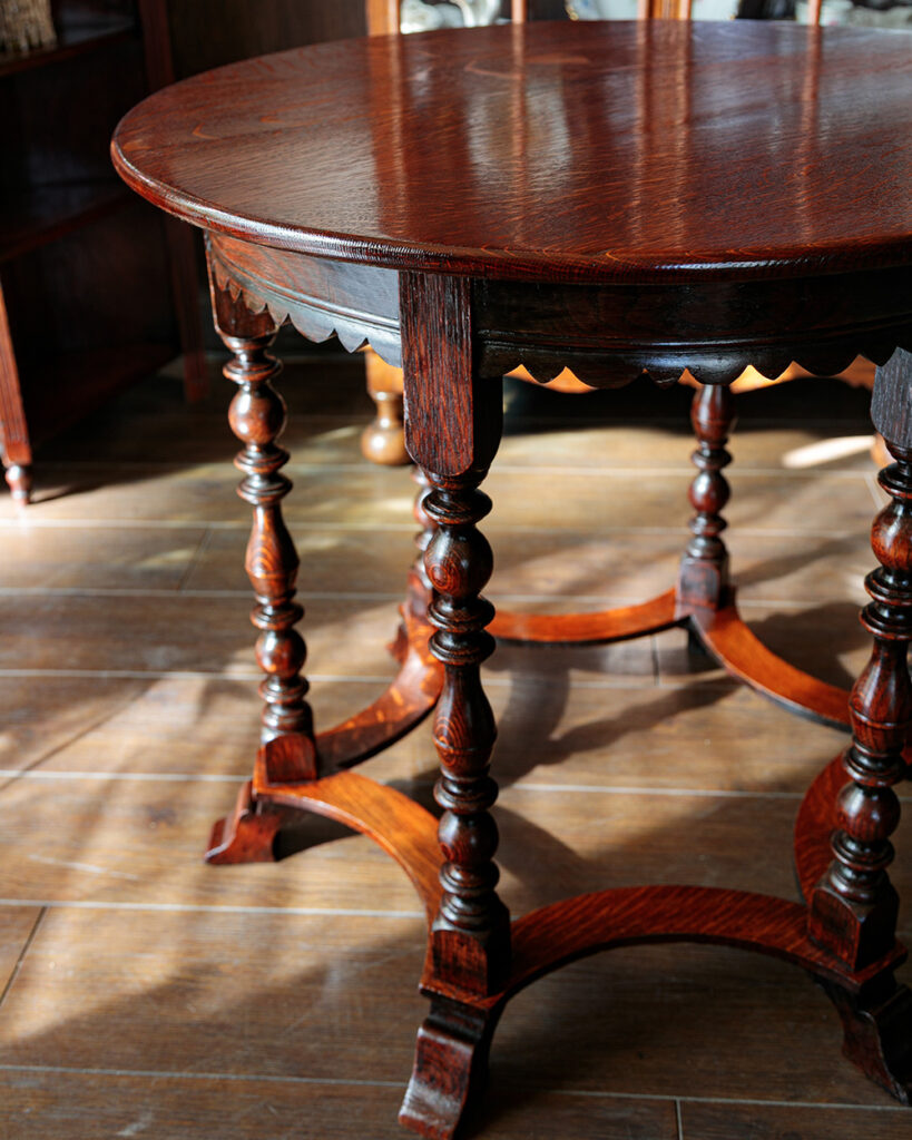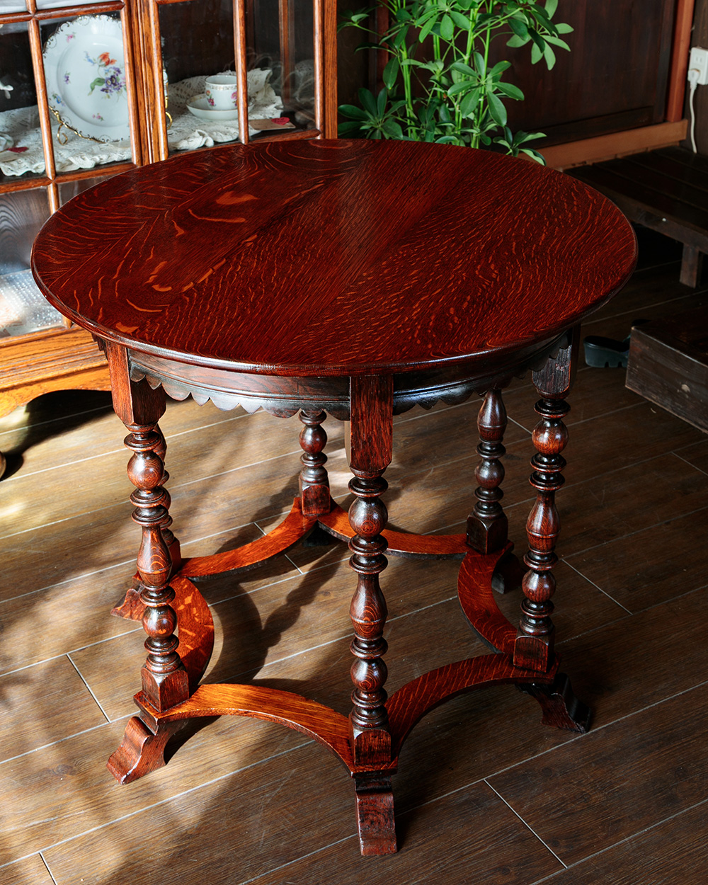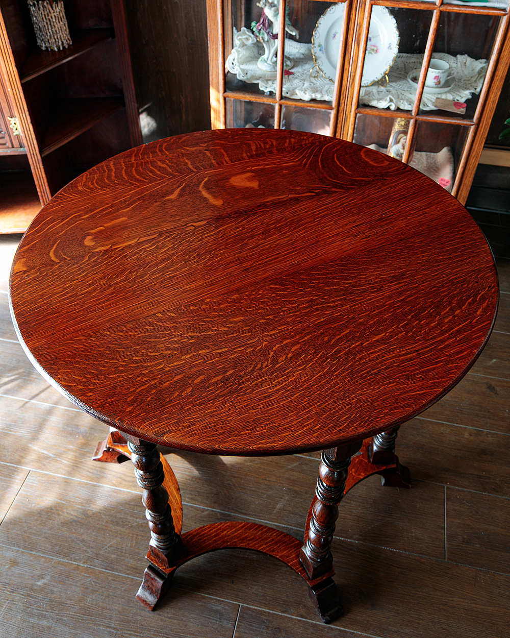 少人数のダイニングテーブルとしてもお考え頂ける大きさのラウンドテーブルで す。1920年代までには採りつくされたというイングランドオークの存在した時代の美しい木目を持つ、上質な家具です。