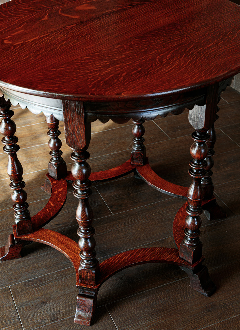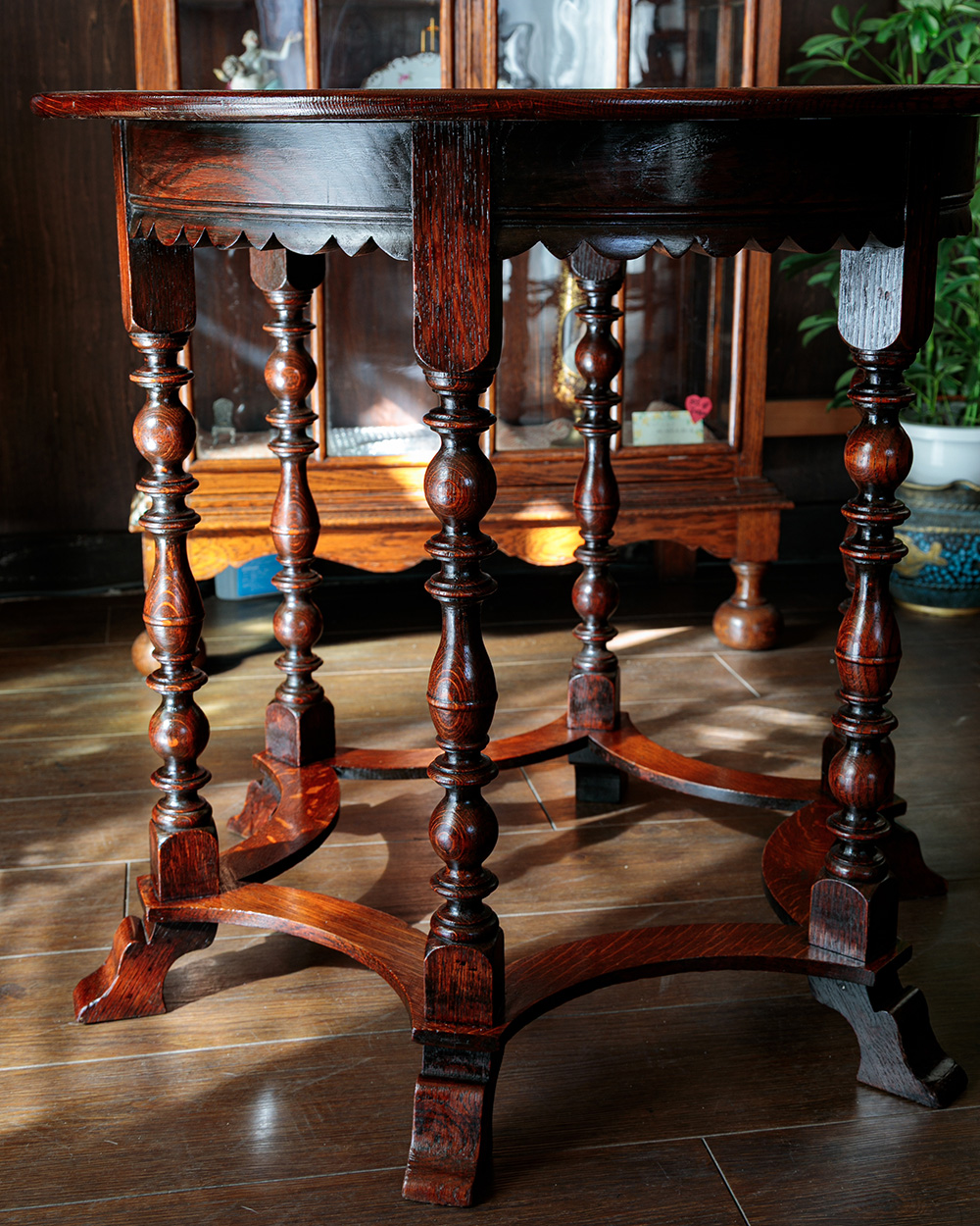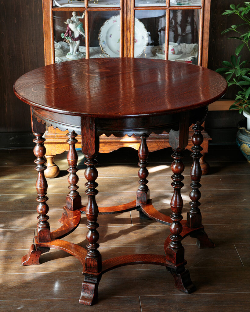 少人数のダイニングテーブルとしてもお考え頂ける大きさのラウンドテーブルで す。1920年代までには採りつくされたというイングランドオークの存在した時代の美しい木目を持つ、上質な家具です。