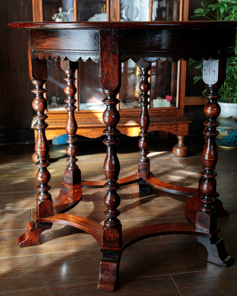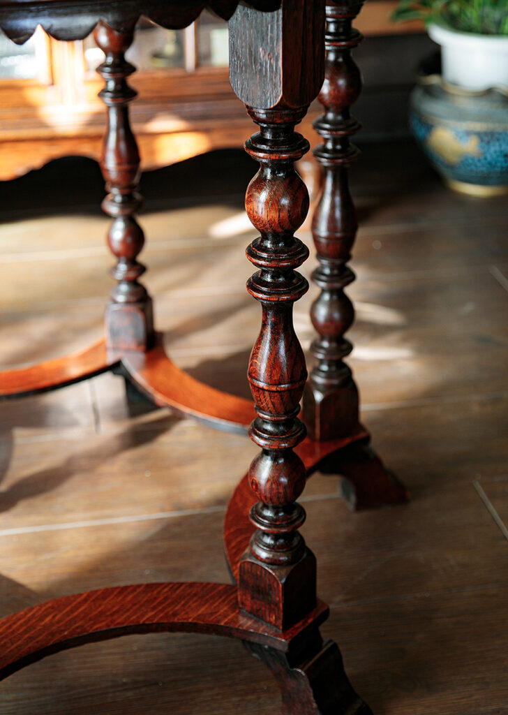 天板下の幕板は厚さ3cmの無垢材でできており、天板をぐるりと支えています。美しいボビンの脚は星形に繋いでいて、足元の美しさもこのテーブルの魅力の一つです。コンディションも良好です。