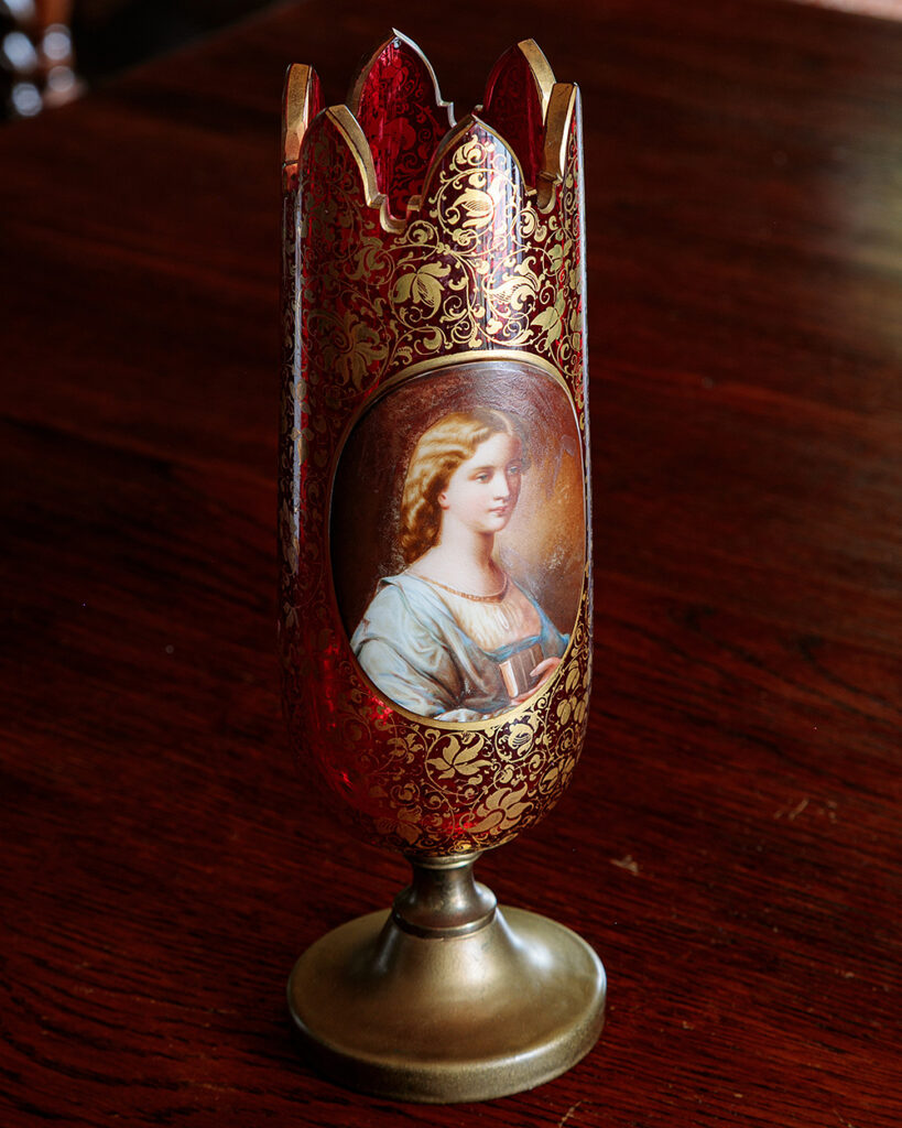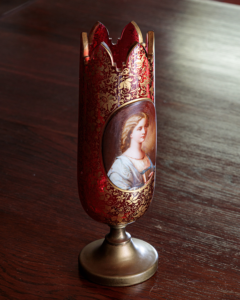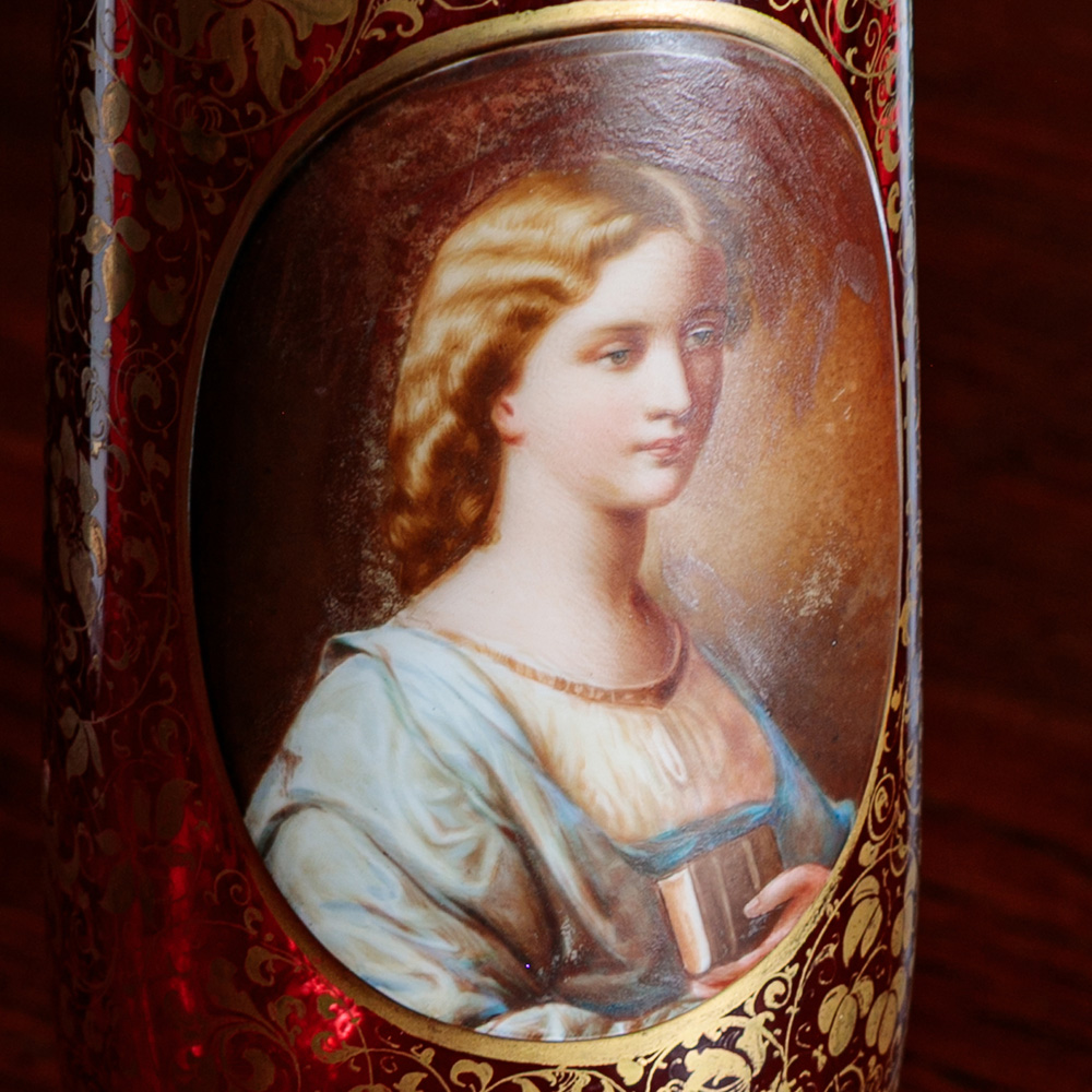 非常に美しいアンティークボヘミアガラスの作品です。 美しい赤ガラスの器体に金彩による細やかな更紗装飾紋が施され、カメオ状の窓に美しい貴婦人像がハンドペイントされています。 貴婦人の透明感ある肌や衣装の質感など見ごたえがあり、高名な画家による肖像画にも劣らぬ逸品です。