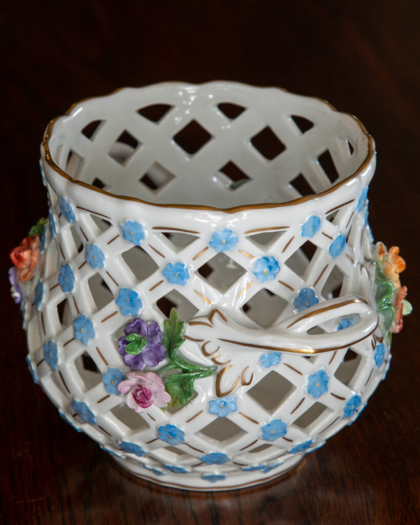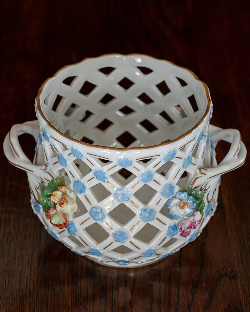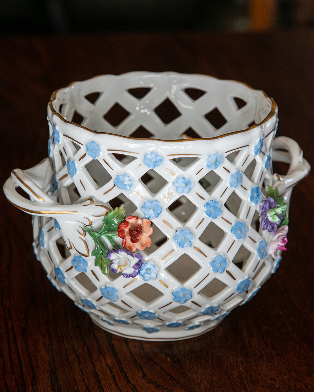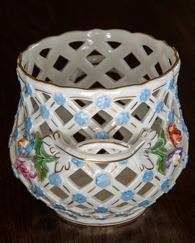 1872年創業のドレスデン カールティーメ工房のテーブルウエアです。 大変美しい透かしバスケットで、小花のアップリケと金彩のラインが入った持ち手の優しいラインが愛らしいお品です。傷や擦れもなく大変コンデションの良いお品です。