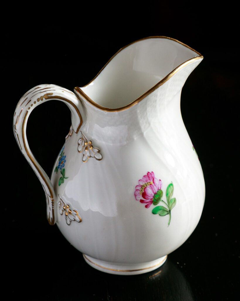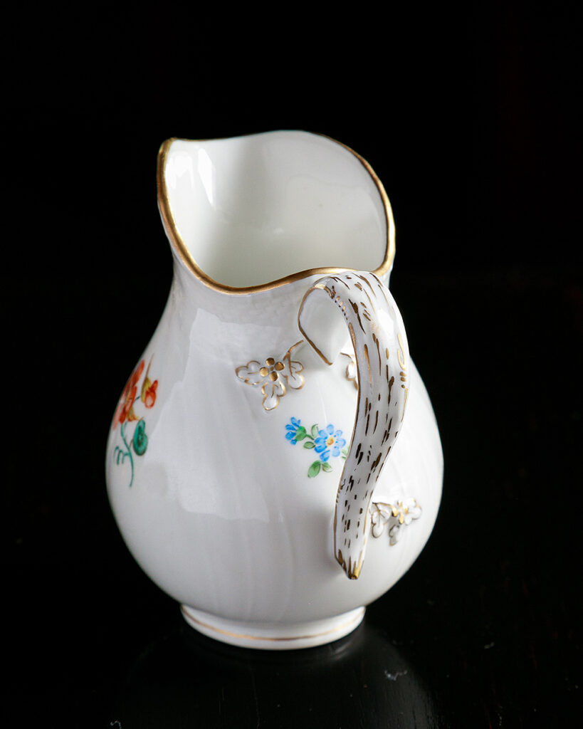 KPM・ベルリン王立磁器製陶所のミルクピッチャーです。ハンドル部分に、植物のレリーフが造形されて、愛らしい器体に小花の絵付けがされています。金彩等の擦れもなくコンデションの良いお品です。