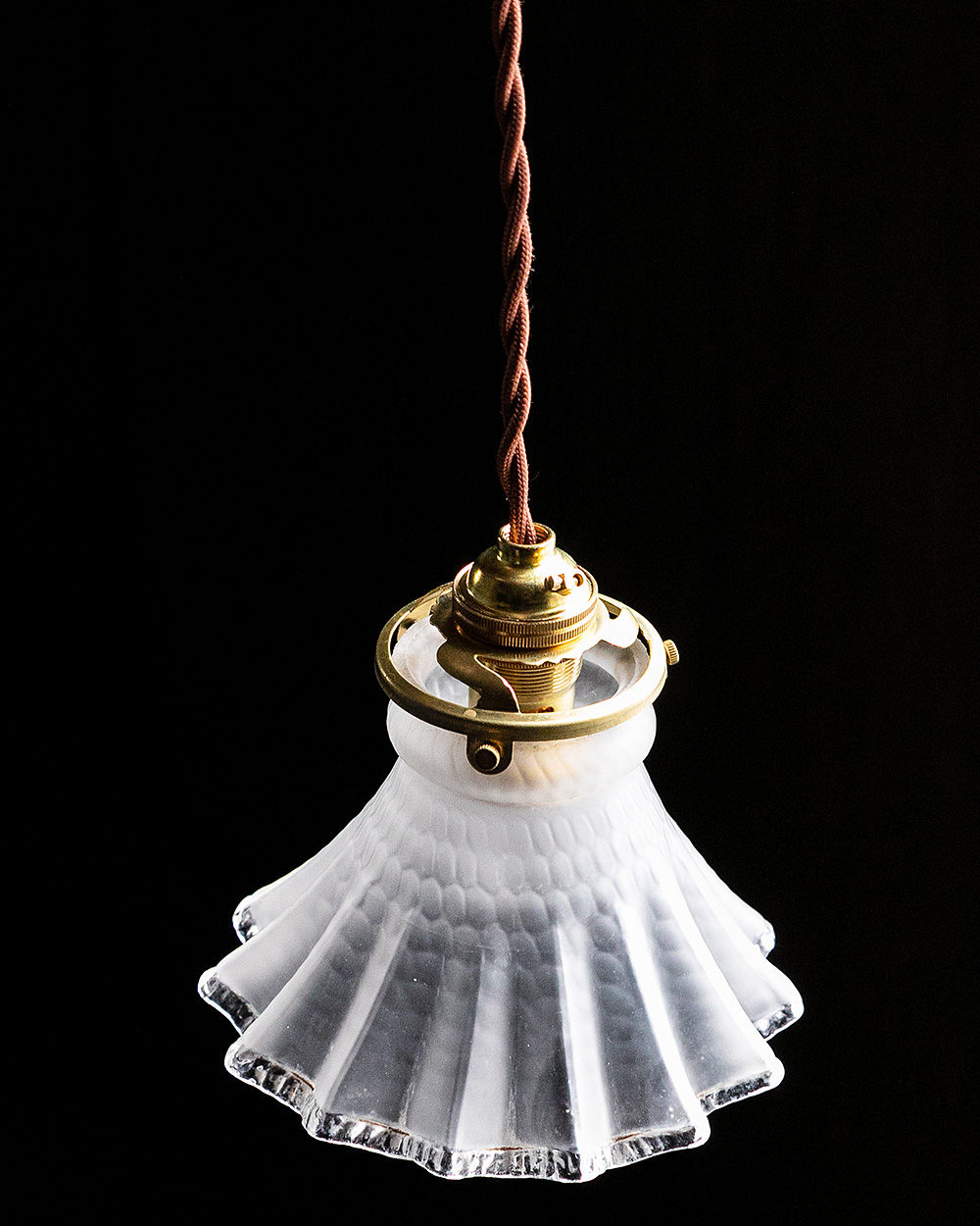 フランスのアンティークガラスランプです。 型吹きで丁寧にフリル型に造形された美しいペンダントランプです。