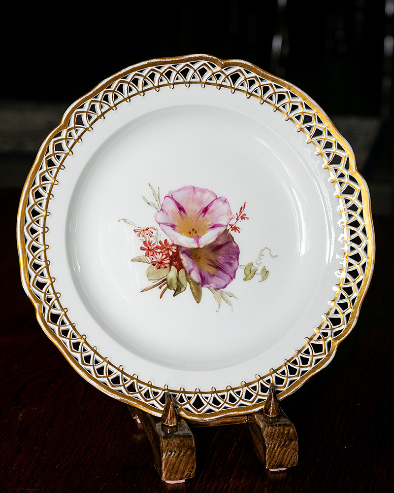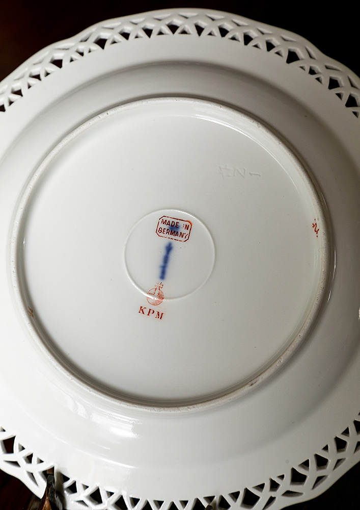 第2次世界大戦後にベルリン窯で製作されたものです。優しい色彩のベルリン王立磁器製陶所のデザートプレートです。透明感ある朝顔の花絵がハンドペイントにて描かれています。縁の透かし彫り装飾の金彩に経年による多少の擦れがあります。