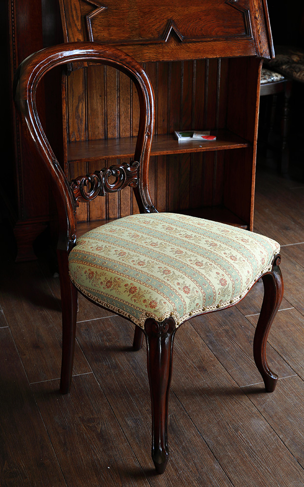 たっぷり大きめの座面を持つバルーンバックサロンチェアです。スッキリとした美しいカーブラインの脚と背に施された彫り。毎日の暮らしに溶け込みながらも上質なものを身近に置く楽しみを感じさせてくれるお品です。座面は優しいグリーン地に小花の上質なファブリックにて張り替えました。