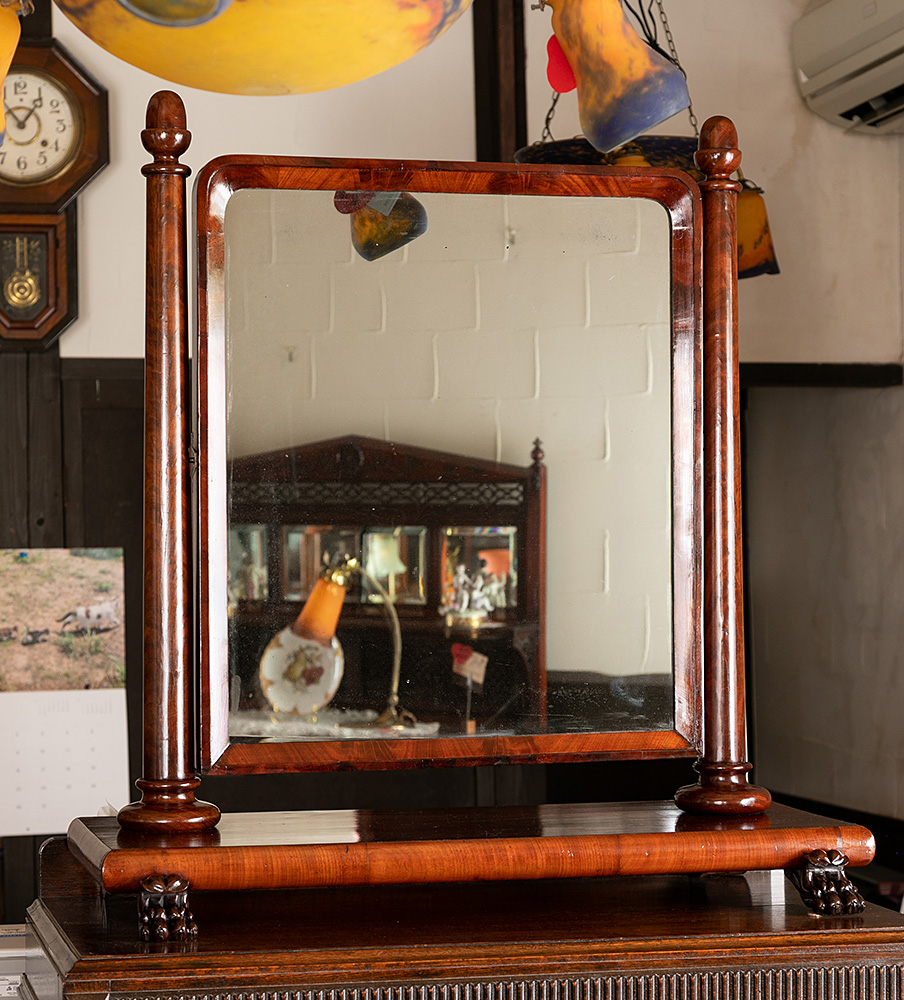 美しいマホガニー材のスタンドミラーです。珍しい鳥獣脚の台座がしっかり大きくて安定しています。サイドボードや横幅のあるチェストの上に置いて頂きご使用頂ければお部屋のフォーカルポイントとしても、実用としても満足頂けると思います。ミラーのコンデションも大変良好です。